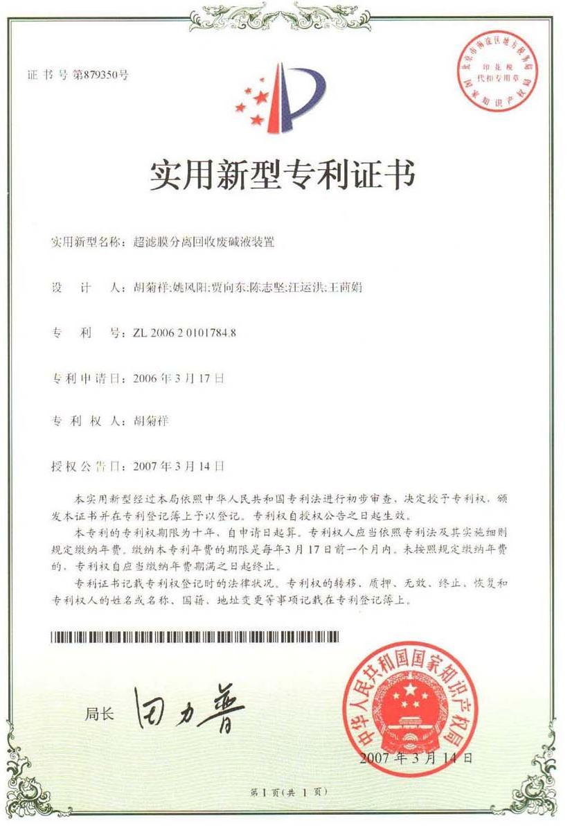 工業廢堿液回收再生裝置國家專利證書